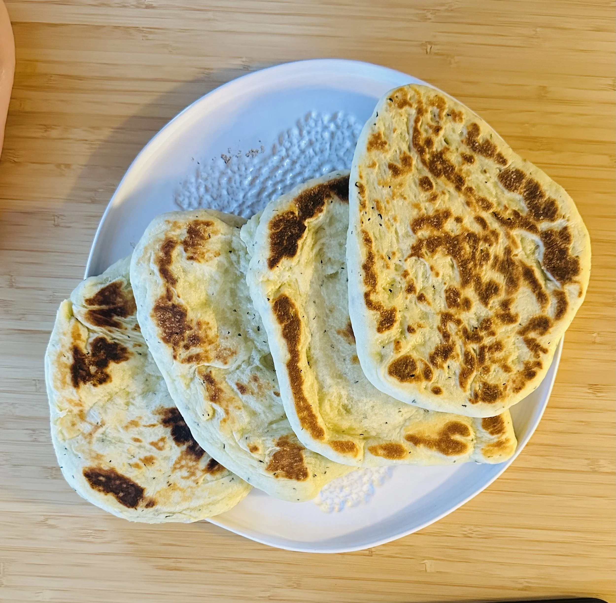Start cooking the naan in the dry pan, a few minutes on each side. Watch them carefully as they burn easily.