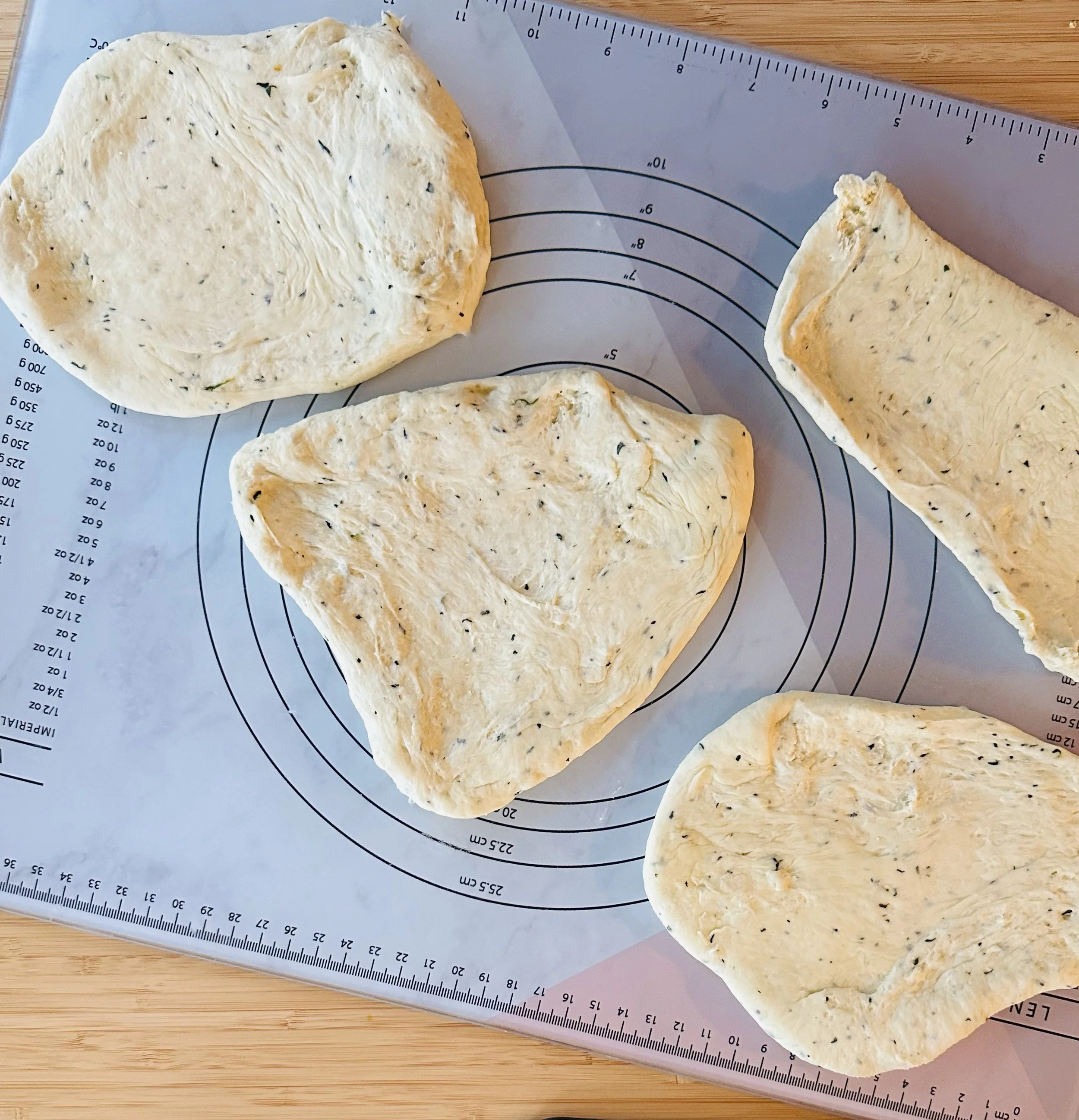 When ready to cook, knock the air out of the dough. Divide into 8 equal balls and flatten each of them to a 0.5 cm thickness.