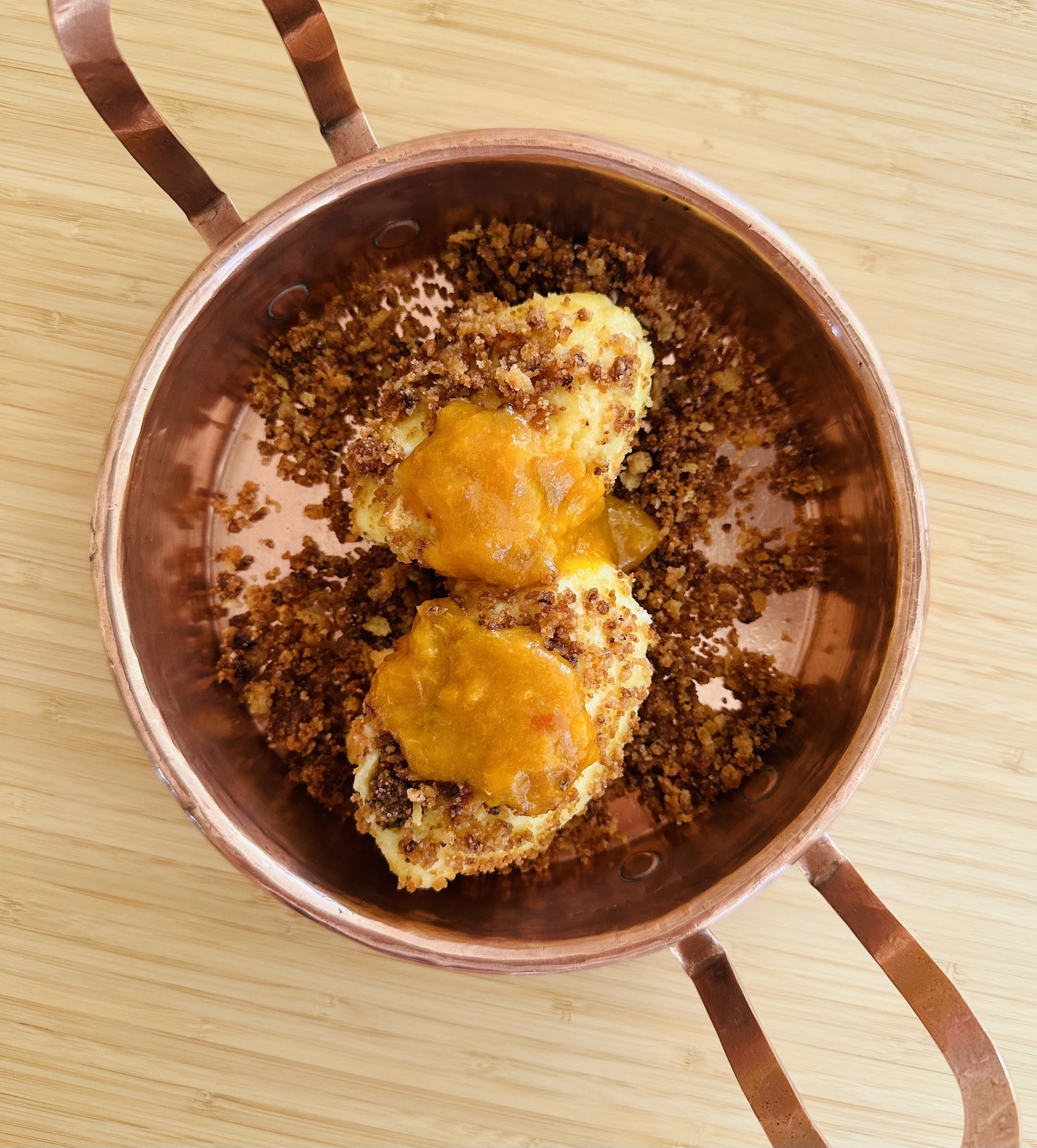 When ready to serve, Place a few dumplings (depending on their size) on a plate with extra toasted breadcrumbs. Drizzle with apricot sauce and add a spoonful of crème fraîche if you’d like.