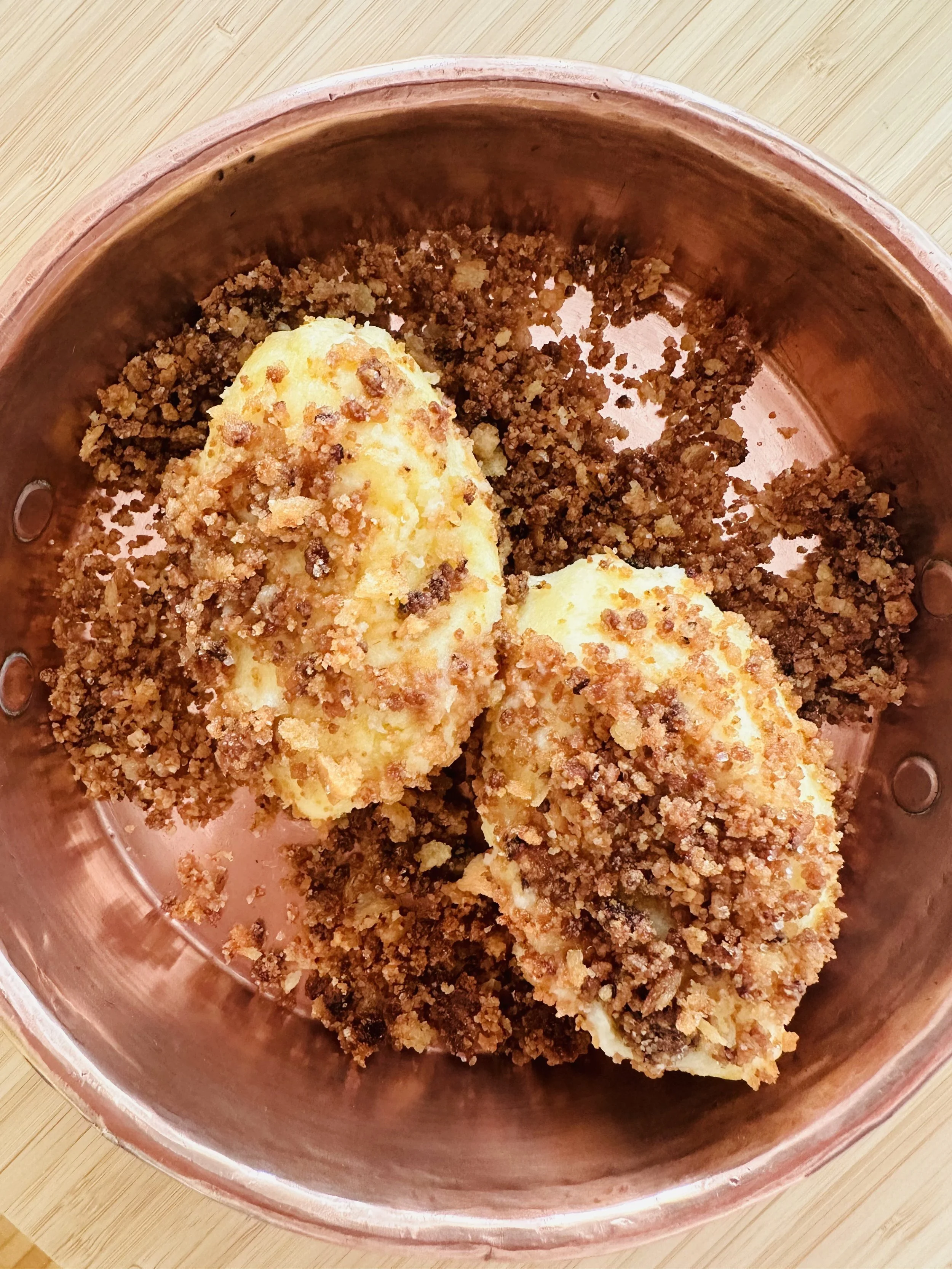 When water is boiling, add the dumplings carefully, one by one. Make sure to not overcrowd the pan. Cook for about 10 minutes, until they rise to the surface. Drain very well individually and drop (not from a height!) in the prepared pan with breadcrumbs. Coat each dumpling as it’s coming out of the water, carefully, as they are rather fluffy and fragile.