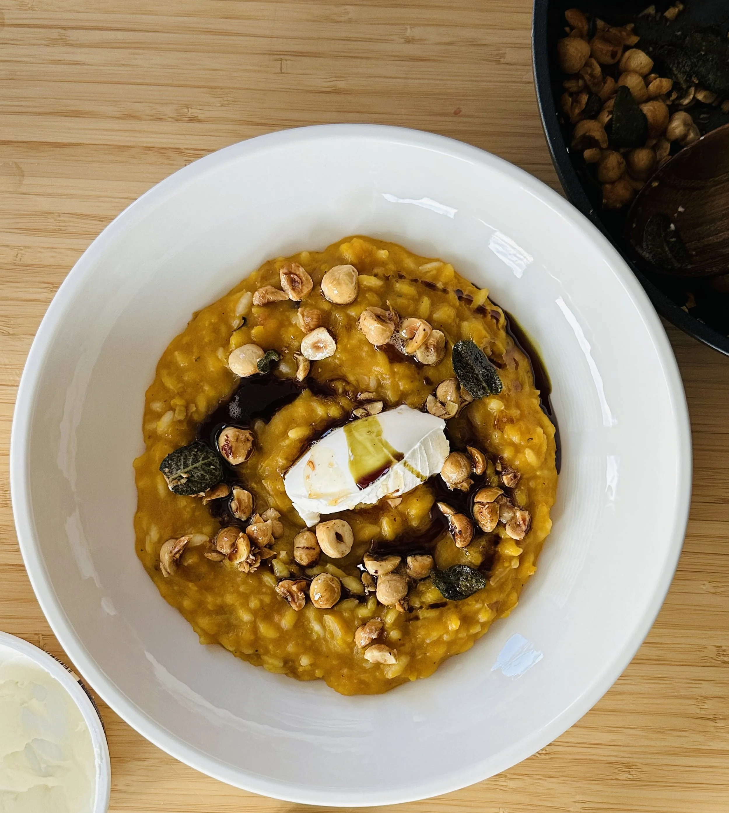 I chose to top the risotto with a few crunchy things, such as hazelnuts and crispy sage, as well as the mascarpone in order to make the meal more suitable for a dinner party, for example. And while if you’re just making this for a weeknight dinner for your family you may want to skip this step, I urge you not to. It really brings everything together so beautifully.