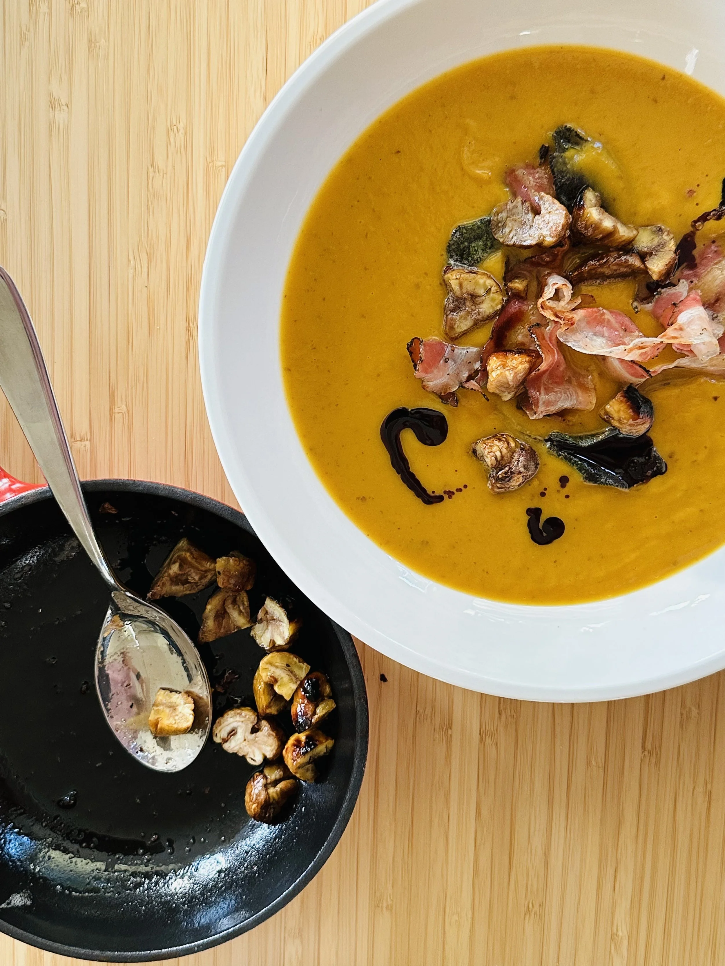 The toppings are in a league of their own: crisp bacon and sage leaves, buttery chestnuts. This soup is as luxurious as it is delicious, all that without even a dash of cream. If you skip the bacon and roast the chestnuts in olive oil, it can even be vegan!