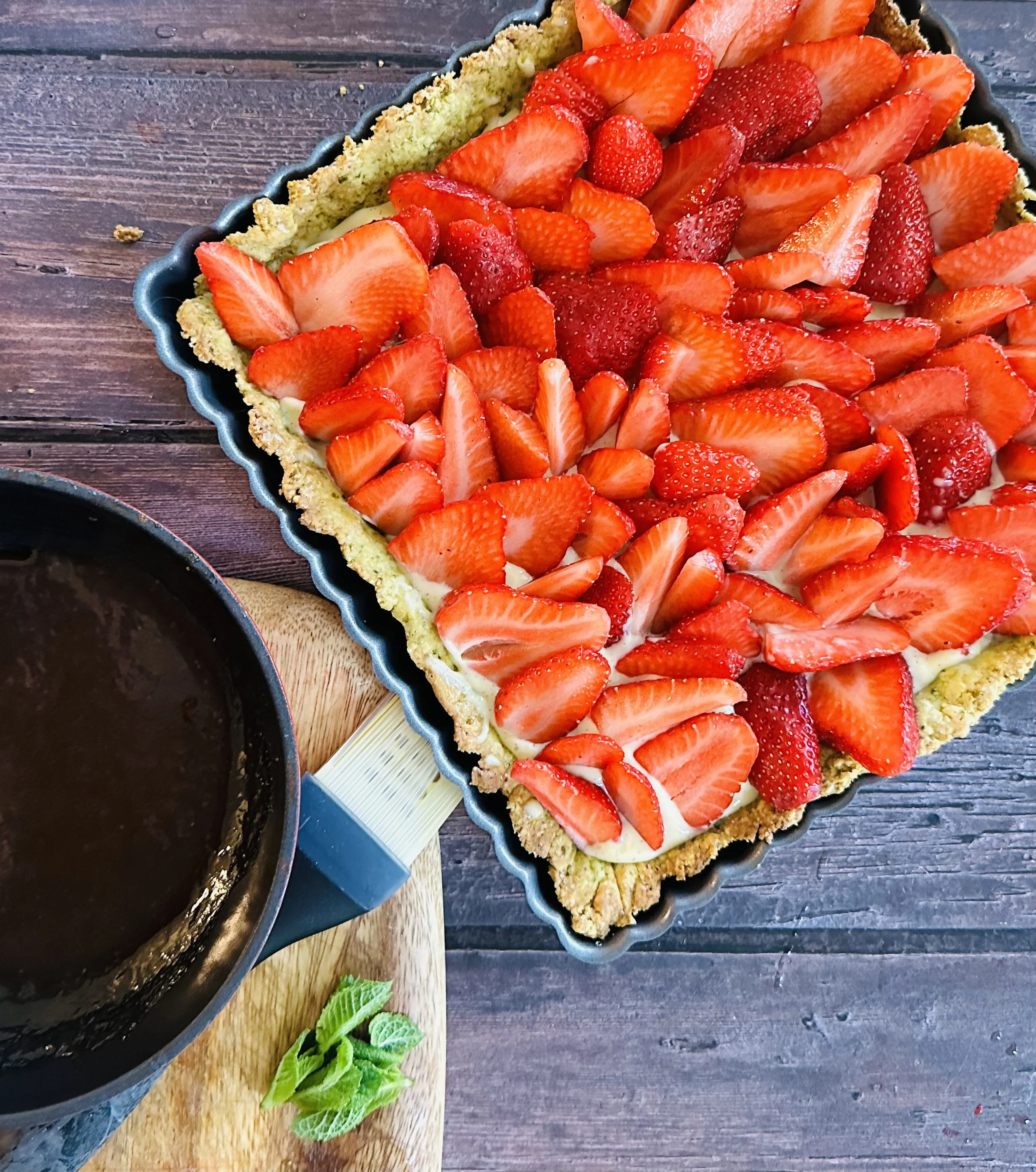 Decorate with plenty of strawberries, really covering the whole tart. Using a pastry brush, brush warm jam all over them and decorate with a few mint leaves for a pop of colour.